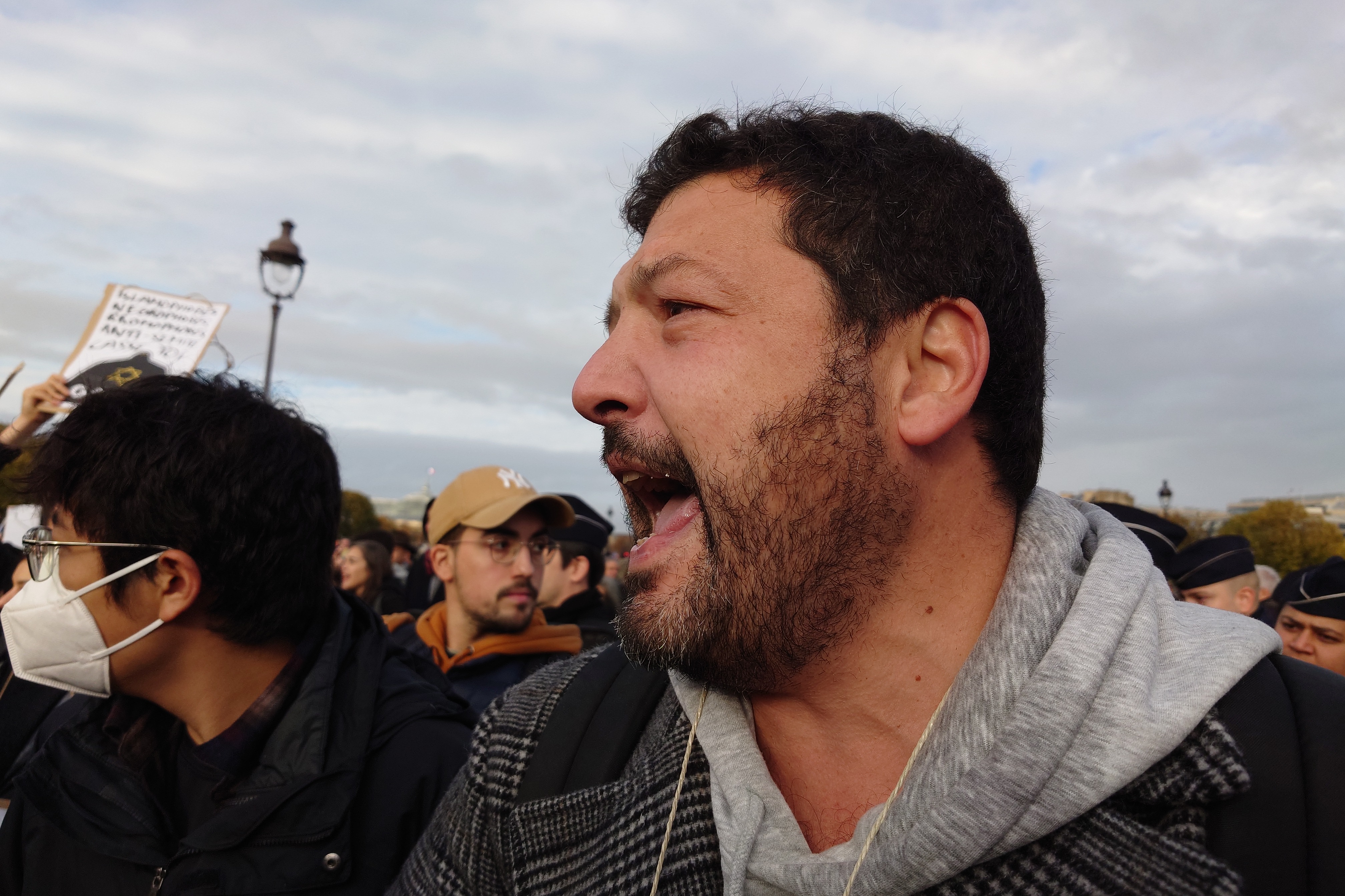Derrière les élus du Rassemblement national, Noam, les yeux bleu profonds comme la mer et le ciel, brandit une affiche taguée #Bringthemhomenow d’Oria Brodutch, 4 ans, otage détenu par le Hamas. Noam et Itamar sont franco-israéliens. Ils sont dans les rangs du Rassemblement national car c’est là que sont les caméras. Tous deux originaires de Jérusalem, ils ont des amis qui étaient au festival et ont été kidnappés, certains ont été tués. La voix et les yeux d’Itamar sont encore plein d’émotion à l’évocation du pogrom du 7 octobre. Aucun des deux n’a voté pour Netanyahu qui « n’a pas su rassembler le peuple ». Ni Noam ni Itamar n’ont encore voté en France, mais aux prochaines élections, Itamar votera pour le Rassemblement national. « La seule voix ferme, c’est Madame Le Pen ». Tous les Juifs présents autour de moi me répètent que la présence du Rassemblement national et de « Reconquête ! » à la marche est selon eux une espérance. « Ce qui est important en tant que Juif, c’est d’entendre un soutien. Surtout maintenant que l’antisémitisme s’exprime à visage découvert dans le métro, sur les murs, et dans les rues de Londres » où Itamar a vécu plusieurs années et où il a pu observé la montée de l’islamisme anglo-saxon. Itamar est indigné par la manifestation londonienne du jour de l’Armistice où ont défilé des manifestants avec des drapeaux de l’État islamique. « C’est un non-respect des humains, des anciens qui se sont battus pour la liberté ». « Et même à Paris ! » se désole-t-il. « Ma femme a peur ». La femme d’Itamar lui a demandé de retirer la mézouza du chambranle de la porte de leur appartement du 12ème arrondissement. « Un peuple qui ne se souvient pas de son passé n’aura pas de futur », lui a dit son grand-père de 92 ans, ancien déporté et survivant de la Shoah, qui vit dans le 93, et qui « aujourd’hui, il a très peur ».