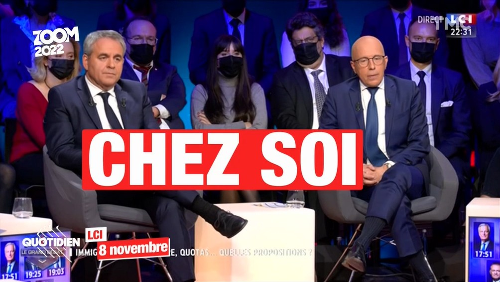 Sur le plateau, une journaliste nous explique qu’elle a « remarqué un truc » (sic) dans les trois débats des candidats à la primaire Les Républicains. Un habile montage nous explique alors qu’il s’agit de l’expression « chez nous« (et de sa variante « chez eux »), appliquée aux migrants et/ou aux Français.
