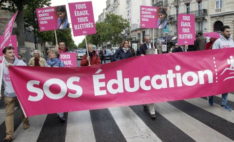 Le syndicat précise que les manifestants étaient « plus de 10.000 » à Paris, bien que la préfecture n’en dénombre que 3 500. Se sont exceptionnellement retrouvés côte à côte le Snes-FSU (gauche), le Snep-FSU (gauche), le Snalc (sans couleur politique), FO (gauche), la CGT (gauche), SUD (extrême gauche) et même… Nathalie Arthaud, successeur d’Arlette Laguiller comme candidate de Lutte Ouvrière à la présidentielle. Entre le Luxembourg et la rue de Grenelle, siège du ministère, c’est au rythme du Chant des Partisans remixé par Zebda, et d’Hexagone de Renaud chanté à tue-tête, qu’une foule de professeurs et de parents d’élèves a défilé en arborant des pancartes vantant l’excellence, le mérite et l’égal accès au savoir. Si la musique se voulait de gauche, les paroles étaient indéniablement de droite. Des pancartes et banderoles affichaient des slogans tels que « Tous égaux, tous illettrés », « A Vitry et à Neuilly, un même droit à l’éducation ».