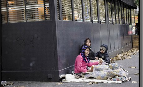 Depuis, ils sont là. Le cri de leurs gosses, étouffé par la distance et les épais vitrages qui nous protègent du froid, fait parfois lever le nez aux cadres plongés dans leurs fichiers Excel. Nous distinguons de temps à autre un petit groupe d’entre eux, une scie à la main, affairés à l’examen d’arbres ; arrêtés autour d’un tronc, ils entreprennent alors de longs conciliabules. Puis ils s’en vont sans hâte. Étaient-ils en repérage ? Reviendront-ils plus tard couper du petit bois ? Nul ne le sait. Ont-ils même le droit d’être là ? Et quand partiront-ils ? Mystère. Mais tous avons vu, qu’il neige ou qu’il vente, cette femme misérable, un gamin dans les bras, implorer la charité devant la boulangerie du coin ; ou cet invalide au sourire édenté avec son gobelet de plastique tendu à des automobilistes impassibles.