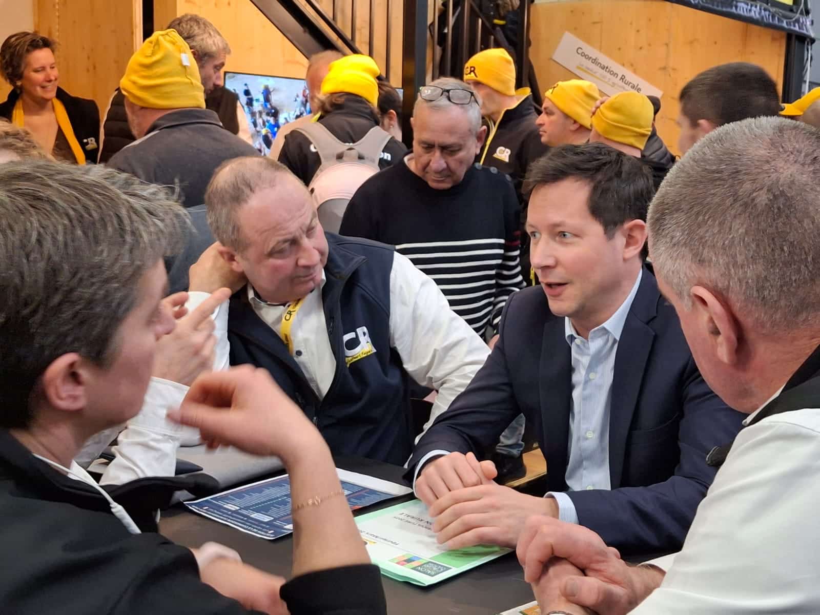 Au cœur du salon, le stand de la Coordination rurale attire le regard en même temps que le chaland. Attroupement de bonnets jaunes qui prennent l’apéritif et se réunissent dans la bonne humeur et l’envie d’en découdre. Un folklore qui séduit tant les professionnels de la terre que les urbains habitués du salon. C’est ici, qu’a rendez-vous le député européen et ancien élu versaillais François-Xavier Bellamy. Difficile rencontre pour l’agrégé en milieu agrarien. La position majoritaire du PPE (Parti populaire européen), groupe parlementaire auquel il appartient à Starsbourg, dont les membres allemands de la CDU-CSU sont les ardents partisans de l’accord de libre-échange avec le Mercosur (Brésil, Argentine, Uruguay, Paraguay et Bolivie), irritent les bonnets jaunes. « Il y a des clivages politiques au Parlement européen mais il y a aussi des clivages nationaux, se défend Bellamy. Les députés de certains groupes n’ont pas forcément les mêmes intérêts. Les partenaires (allemands) de Marine le Pen sont par exemple favorables au Mercosur car ils savent qu’ils pourront vendre leur production industrielle en Amérique latine » (le député faisant peu de cas de la rupture entre le RN et l’AfD au printemps dernier) mais essuie les questions acerbes des paysans : « comment pouvez-vous rester dans un groupe parlementaire pareil ? » « Je comprends le ressentiment du monde paysan… » nous confie l’élu.