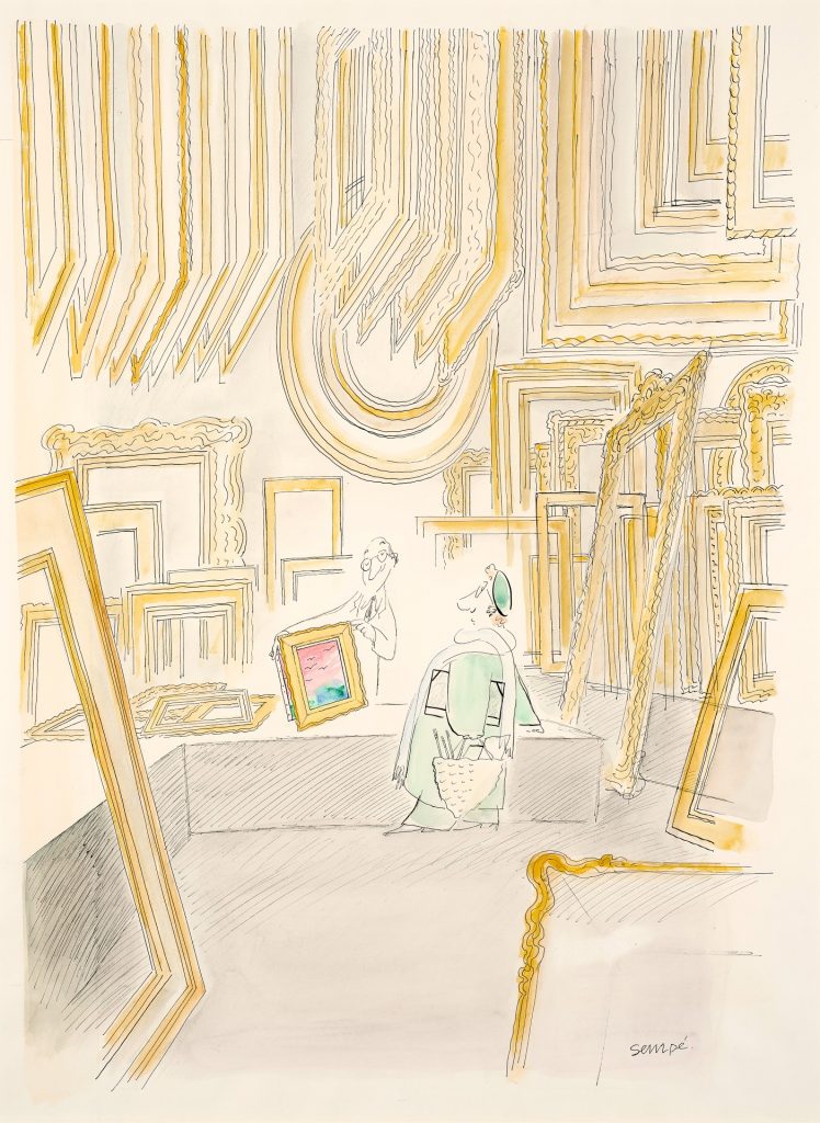 L’exposition-vente, qui aura lieu le 19 juin prochain chez Artcurial, (catalogue en ligne sur artcurial.com) retracera le panorama de cet univers, de cette galerie de portraits saisissants et familiers qui nous ont tous accompagnés et depuis toujours. Quand on interroge Sempé sur cet événement, lui qui, il y a peu, était surnommé « monument national » par un grand journal du soir, répond sans fausse pudeur : « Ça me touche beaucoup qu’Artcurial accepte d’exposer mes dessins comme nous l’avions imaginé il y a quelques années. Et je suis tout émoustillé à l’idée que des gens achètent mes dessins. Ça me donne l’impression d’avoir fait quelque chose d’acceptable, alors que je pense souvent le contraire. Et je crains, hélas, que cela flatte énormément ma vanité, ce qui n’est pas le meilleur côté de ma personnalité ! »