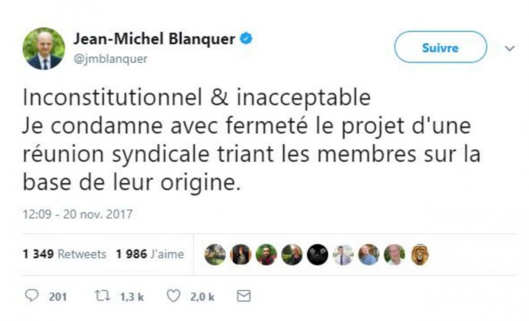Je condamne avec fermeté le projet d’une réunion syndicale triant les membres sur la base de leur origine.— Jean-Michel Blanquer (@jmblanquer) 20 novembre 2017