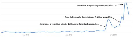 La visibilité de Dieudonné ces dernières semaines a très probablement attiré des profils très variés, qu’il serait d’ailleurs très difficile de partitionner en deux groupes. L’adhésion totale ou partielle, la naïveté, la curiosité, la lutte ou l’incompréhension peuvent être autant de motivations susceptibles d’encourager des internautes à consulter de telles vidéos. Aussi, il n’est pas évident que les idées de Dieudonné soient si clairement perceptibles par toutes les personnes qui s’intéressent au personnage, et nombreux sont ceux qui furent plus préoccupés par la décision du ministre de l’Intérieur, puis du Conseil d’État. Pour s’en convaincre, il suffit de voir que les deux étapes décisives dans l’augmentation de la visibilité de Dieudonné ces dix dernières années tiennent précisément à ces deux décisions (fig. 2).