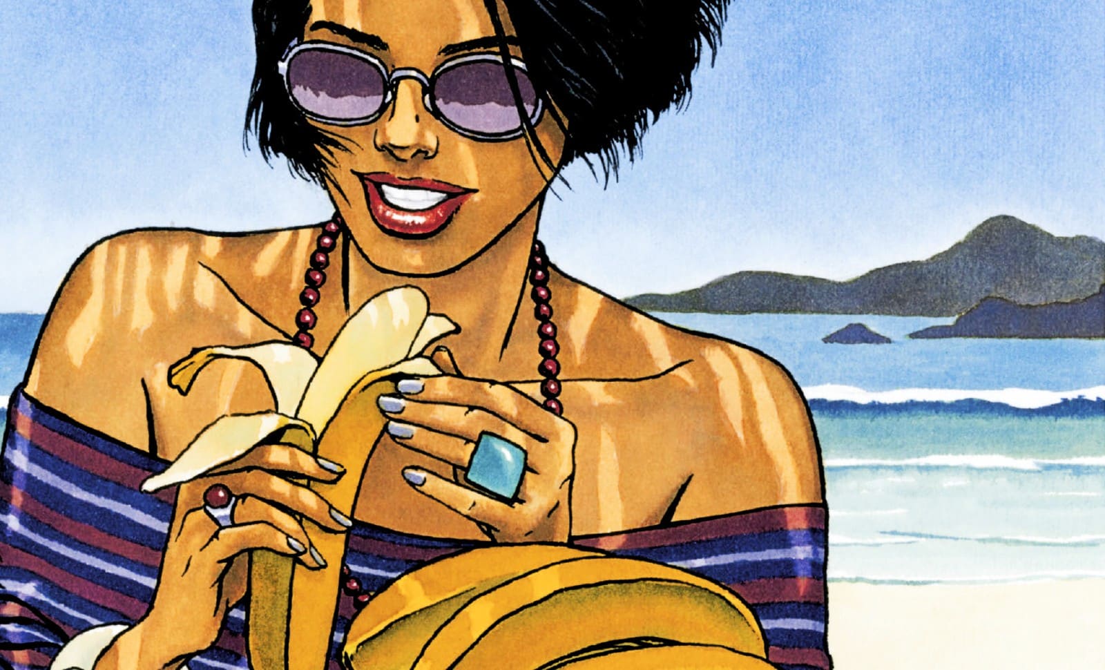 Pour capturer une Italie plus vénéneuse et sensuelle, Vittorio Giardino, dessinateur et coloriste de génie, nous propose quelques histoires dramatiques dans Vacances fatales, notamment celle intitulée « Sous un faux nom » qui se déroule à Capri. Sa planche (page 34) est l’une des plus suggestives et des plus charnelles de sa production. Sans rien dévoiler de l’intimité de la personne, il nous montre, en sept cases, une brune en hautes espadrilles, nous ne voyons d’elle que son profil, plus bas, une fine cheville, puis on remonte sur son rouge à lèvre, elle allume une cigarette et nous savons qu’elle nous fera souffrir et que nous aimerons ça.