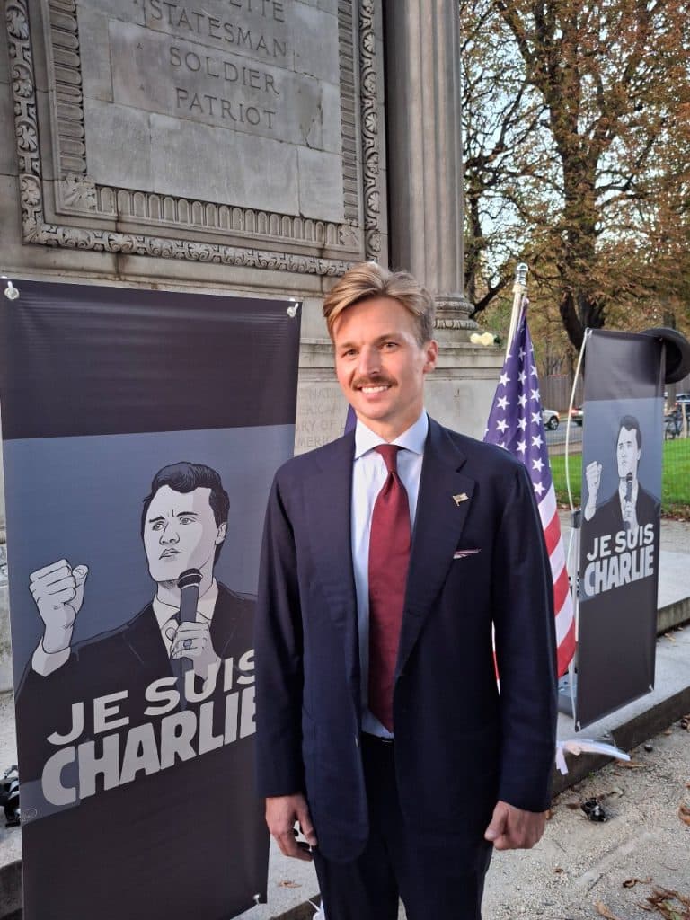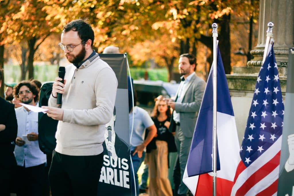 Organisé dans l’urgence de l’émotion, le rassemblement a réuni toute la galaxie des trumpistes français, familiers des vidéos de Charlie Kirk bien avant que son assassinat n’en fasse une icône du conservatisme mondial. Au micro se sont succédé Philippe Karsenty, ancien adjoint à la mairie de Neuilly-sur-Seine et animateur du comité Trump France, puis Kate Pesey, directrice de la bourse Tocqueville, qui « perpétue l’héritage intellectuel d’Alexis de Tocqueville » en envoyant chaque année de jeunes gens prometteurs découvrir le modèle politique américain. Elle a déclaré mener un combat « contre les forces anti-chrétiennes », tandis qu’un abbé venu spécialement a fait réciter un Notre-Père, le tout sous une banderole « Je suis Charlie » en hommage aux laïcards de Charlie Hebdo. Singulier syncrétisme : un brin de biblisme américain mêlé à l’esprit voltairien français.