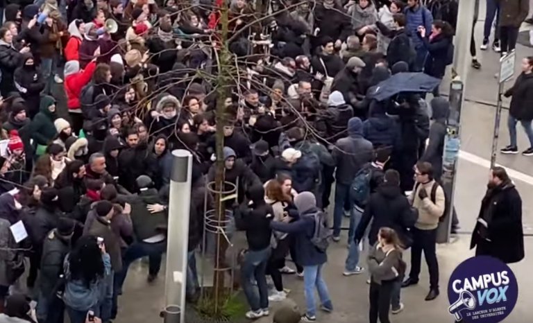 Aux gros bras habituels du monde étudiant d’extrême gauche s’ajoutent des grévistes d’une cinquantaine d’années venus tout droit de la RATP et de la Poste, à en croire un reportage de Campus Vox, média alternatif qui se targue sur Youtube de mettre en lumière les atteintes à la liberté d’expression et à la liberté d’étudier au sein du système universitaire.