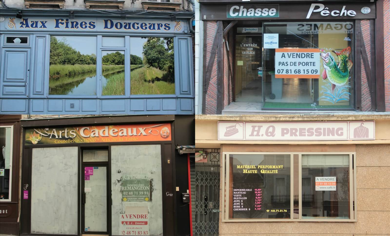 C’est en sa compagnie que j’arpente la rue Joffre. Sans égaler la munificence du vieux Bourges voisin, le cachet de cette allée piétonne entourée de maisons à colombage n’est pas sans charmes. Cela n’a pas suffi à enrayer la Bérézina commerciale. Malheur au voyageur de passage qui souhaiterait goûter la typique galette de pommes de terre. Trouver une boulangerie encore sur pied relève de la gageure. Sur les innombrables vitrines ceintes de panneaux « À vendre », les mots des commerçants ayant lâché l’affaire font figure d’ex-voto adressés à leur clientèle. Quelques trompe-l’œil que la mairie a installés sur les enseignes rappellent cruellement l’impuissance des pouvoirs publics. Un tas d’ordures trône fièrement devant une agence immobilière fermée depuis 2008.