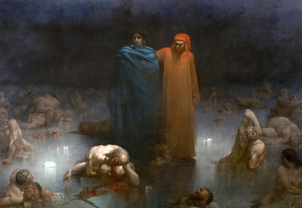 Une place non négligeable est consacrée aux œuvres inspirées par les descriptions de Dante. Son poème est si marquant qu’en définitive, l’Enfer, c’est lui. Les artistes s’en emparent dès le xive siècle. Ceux des xvie et xviie siècles développent toute une iconographie basée sur les mêmes sources poétiques jusqu’à ce que leurs suiveurs, au xixe, les rendent plus spectaculaires encore en osant des cadrages que l’on peut qualifier de cinématographiques et en réduisant les sujets à quelques figures essentielles. Les toiles de Gustave Doré peuplent notre imaginaire collectif. Le visage aux traits aiguisés du poète y est quasiment sacralisé, c’est un profil de médaille immédiatement identifiable qui traverse paysages désolés et scènes terrifiantes. Le Dante et Virgile dans le neuvième cercle de l’Enfer est glaçant dans le moindre détail, jusqu’à la lumière gelée que semble contenir la banquise sur laquelle ils cheminent parmi les mourants. Peints par Bouguereau, ces témoins de l’horreur s’effacent au second plan pour permettre au spectateur de voir le violent combat durant lequel Capocchio est mordu au cou par Gianni Schicchi.