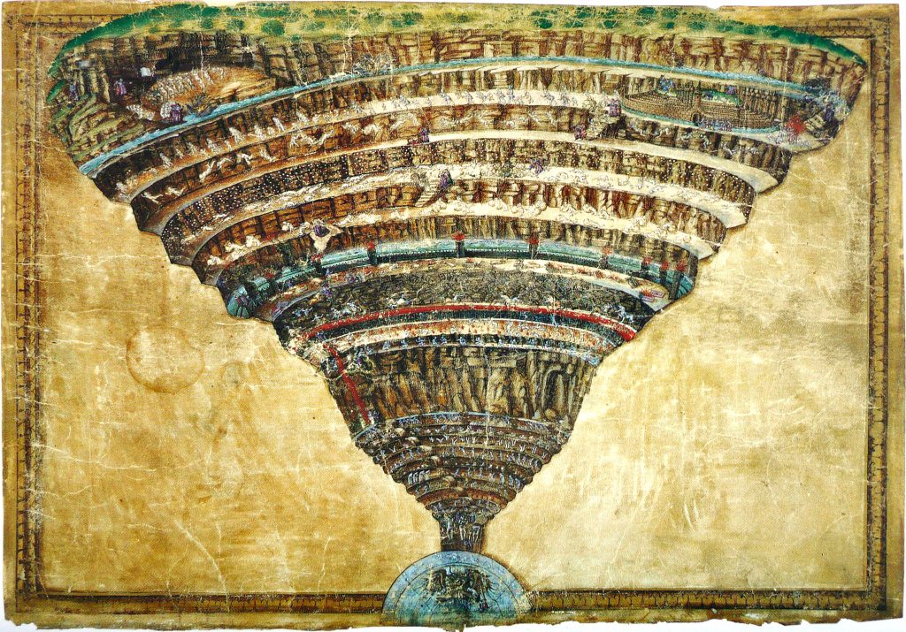 L’Enfer est aussi vieux que l’humanité, si ce n’est plus. Bien avant les Grecs et les Romains, Gilgamesh en fait le récit. La catabase, cette descente d’un vivant au royaume des morts pour revenir en témoigner, fascine et effraie. C’est le point de départ de La Divine Comédie de Dante, dont on célèbre cette année le 700e anniversaire de la mort. Dans cette œuvre inclassable – « la seule chose éternelle que l’homme a en sa possession », selon Hermann Hesse –, le lecteur est aux côtés du poète florentin dans sa vision, son excursion, son incursion autant philosophique que littéraire et théologique à travers l’Enfer, le Purgatoire et le Paradis. Il est pour cela guidé par Virgile, par Béatrice – sa bien-aimée – puis par saint Bernard de Clairvaux. Dante est viator et scriba, pèlerin et écrivain. L’Enfer, il le localise géographiquement, il lui donne une forme. Dans sa préface à la nouvelle réédition du texte dans la Pléiade (voir encadré), Carlo Ossola le résume ainsi : « L’Enfer est une sorte d’immense entonnoir créé lors de la chute de Lucifer, emprisonné au centre de la Terre un instant après la Création. Déplacée par l’impact, l’énorme masse réapparaît aux antipodes sous la forme d’une montagne, dans l’hémisphère austral : c’est le mont du Purgatoire, couronné en son sommet par le Paradis terrestre, où Béatrice se manifeste à Dante. De là, le poète s’élève de ciel en ciel, jusqu’au ciel des étoiles fixes puis à l’Empyrée, où saint Bernard, dans le dernier chant du poème, prononce sa célèbre « prière à la Vierge » pour qu’elle permette au pèlerin de contempler le mystère de la Trinité. » Cet entonnoir infernal, Botticelli le représente dans ses illustrations de la Commedia au cours des années 1480.