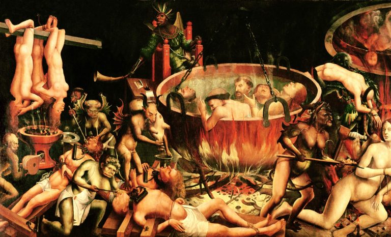 Les portes de l’interprétation ouvertes par Dante au début du xive siècle ne se sont jamais refermées. Celles de l’Enfer de Rodin ont fait le voyage depuis Paris – prêt exceptionnel pour ce plâtre original – afin de trôner face à un chef-d’œuvre méconnu : La Chute des anges rebelles, attribué à Francesco Bertos, et daté de 1725. Un marbre ahurissant de virtuosité, une prouesse déjouant les lois de la gravité, offrant une vision baroque nettement moins sanglante que les représentations lucifériennes que le visiteur est ensuite amené à découvrir, telle cette peinture anonyme qui n’est rien d’autre qu’une scène de boucherie humaine. On frissonne devant ce spectacle d’hommes et de femmes nus, torturés dans d’infâmes supplices au réalisme saisissant. Parmi les pécheurs, on reconnaît de nombreux religieux. Les contemporains de cette œuvre du début du xvie siècle connaissaient la réalité de ces châtiments, ce sont des tortures judiciaires. La douleur de la pénitence devient tangible. Beaucoup de codes nous échappent aujourd’hui pour comprendre le sens de chaque partie, mais l’on peut aisément concevoir la crainte que de telles images suscitaient. Il en va de même pour ces bouches effrayantes, nées dans l’imaginaire des enlumineurs anglais à l’aube de l’an mille, dévorant par dizaines ces âmes qui ont fauté. Les scènes de Pieter Huys et de Jérôme Bosch ont aussi conservé leur force d’évocation, mais elles devaient être bien plus qu’une démonstration de fantaisie macabre : leurs animaux étranges et merveilleux se jouent du malheur des pécheurs, ils participent à leur supplice entre éviscérations, chairs bouillies et amputations.