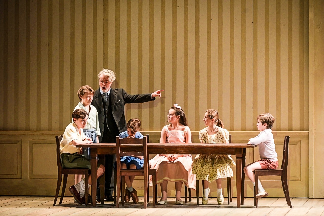 Créée l’an passé à la Scala de Milan, la présente production qu’accueille le TCE pour quelques représentations choisit, sous les auspices du metteur en scène Christof Loy, de transposer l’action à l’époque contemporaine, quelque part entre les années 50 et 60, dans un éclairage assez froid et presque constant, sur un décor rigide qui – mur tendu d’un papier peint à rayures – évoque le salon d’une maison bourgeoise dont la double porte centrale, coulissante, ouvre, en arrière-plan, sur une salle à manger donnant elle-même sur un jardin, au fond, planté d’un arbre dont les ramures marqueront, au fil du spectacle, le passage des saisons.