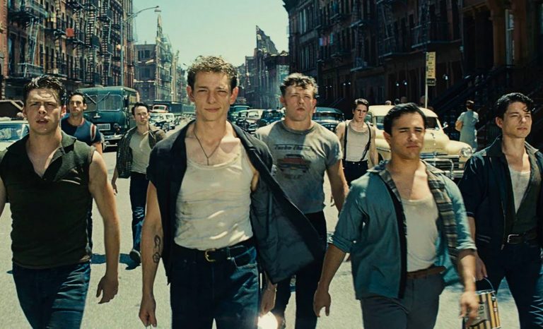 Un monde disparait, c’est l’histoire de ce monde que raconte le cinéaste très inspiré. Il conserve du film originel la musique de Leonard Bernstein et magnifie les chansons de Stephen Sondheim. Tout en signant un film profondément moderne sur le fond, Steven Spielberg signe une œuvre d’un grand classicisme formel. Racisme, mais surtout pauvreté et exclusion sociale hantent les héros sans tomber dans les travers sociétaux d’aujourd’hui, hormis la transformation ridicule du garçon manqué du film de Robert Wise en transgenre. Les garçons qui font partie des Jets et des Sharks sont surtout des fortes têtes, des jeunes perdus et amers, qui n’ont aucun avenir devant eux et qui par ennui et goût du jeu s’affirment dans les bagarres où ils s’affrontent afin de prouver leur existence et leur virilité plus par défi que mus par une haine raciale fondamentale.