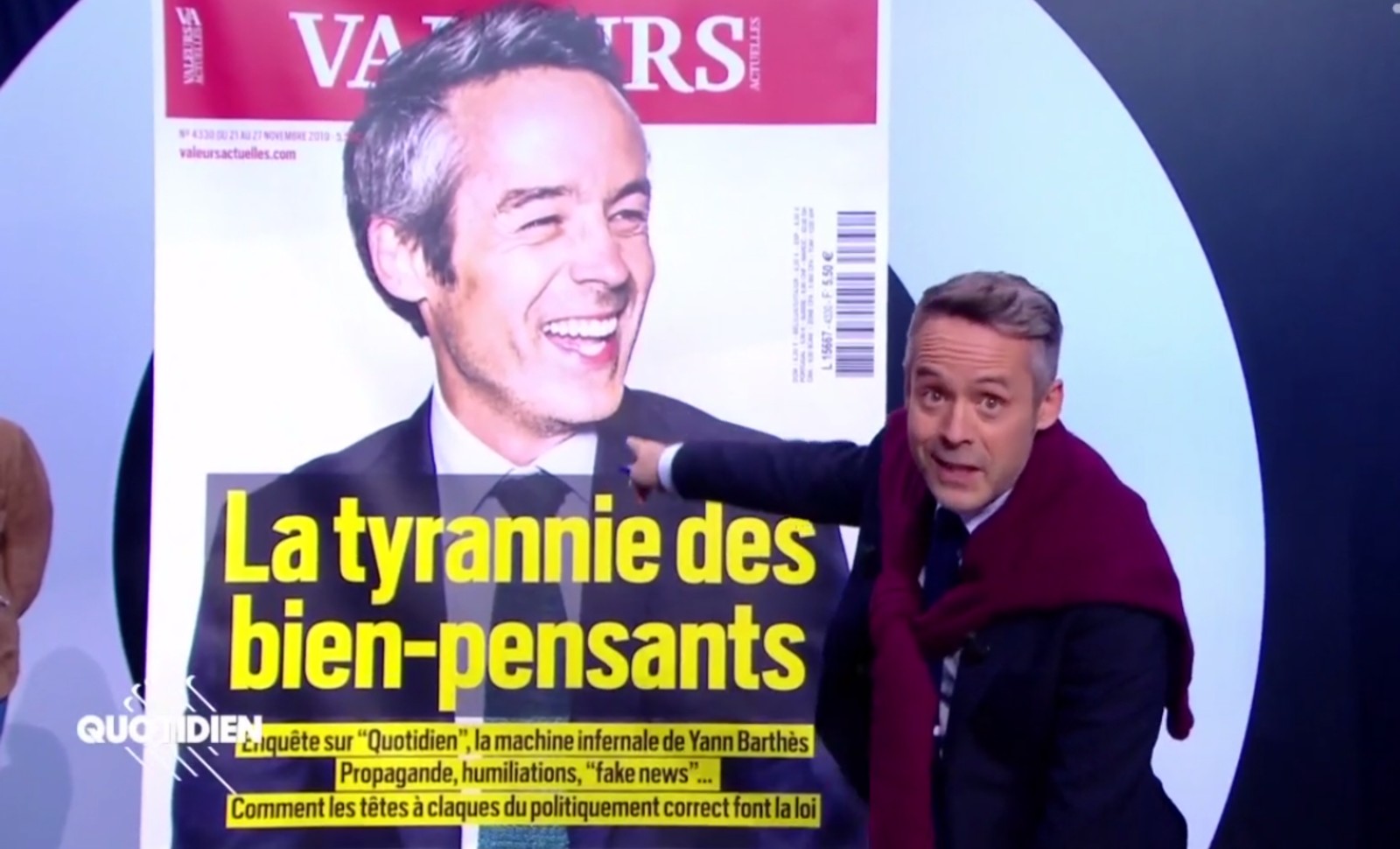 Autre hic, à Quotidien, tous pensent à peu près la même chose! Et sur à peu près tous les sujets. Dans ce petit royaume du sourire en coin et des œillades énamourées avec les comiques france interiens, c’est simple: les gentils lisent Edwy Plenel et les méchants lisent Elisabeth Lévy. Alors, imaginez ce que tous ces adeptes de la bonne pensée peuvent penser de Valeurs actuelles!